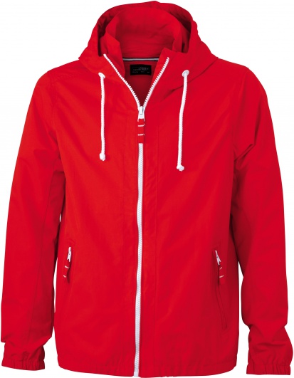 Young functional allweather jacket. Outer fabric: 100% Polyester. Sturdy, wind- and water-repellent fabric (1,500 mm water column). Hood with cord. 2 zipped side pockets. Full-length storm flap with chin-cup. Zips and cord in contrasting colour.