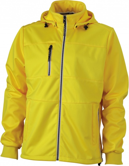 Young softshell jacket with fashionable details. Outer fabric (290 g/m²): 100% Polyester. 3-layer functional material with TPU-membrane. Wind- and waterproof (5,000 mm water column), breathable and permeable to vapour. Non-taped seams. Stand-up collar, detachable hood. 2 side pockets and 1 zipped breast pocket. Elastic cord with stopper on hood and waistband. Zip for decoration. Zips and lateral band in contrasting colour. Knitted sleeve cuffs.